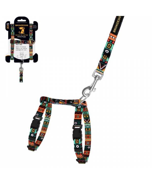 Шлея з поводом для котів та дрібних собак BronzeDog Urban етнічна ментол розмір ХS з нашивкою